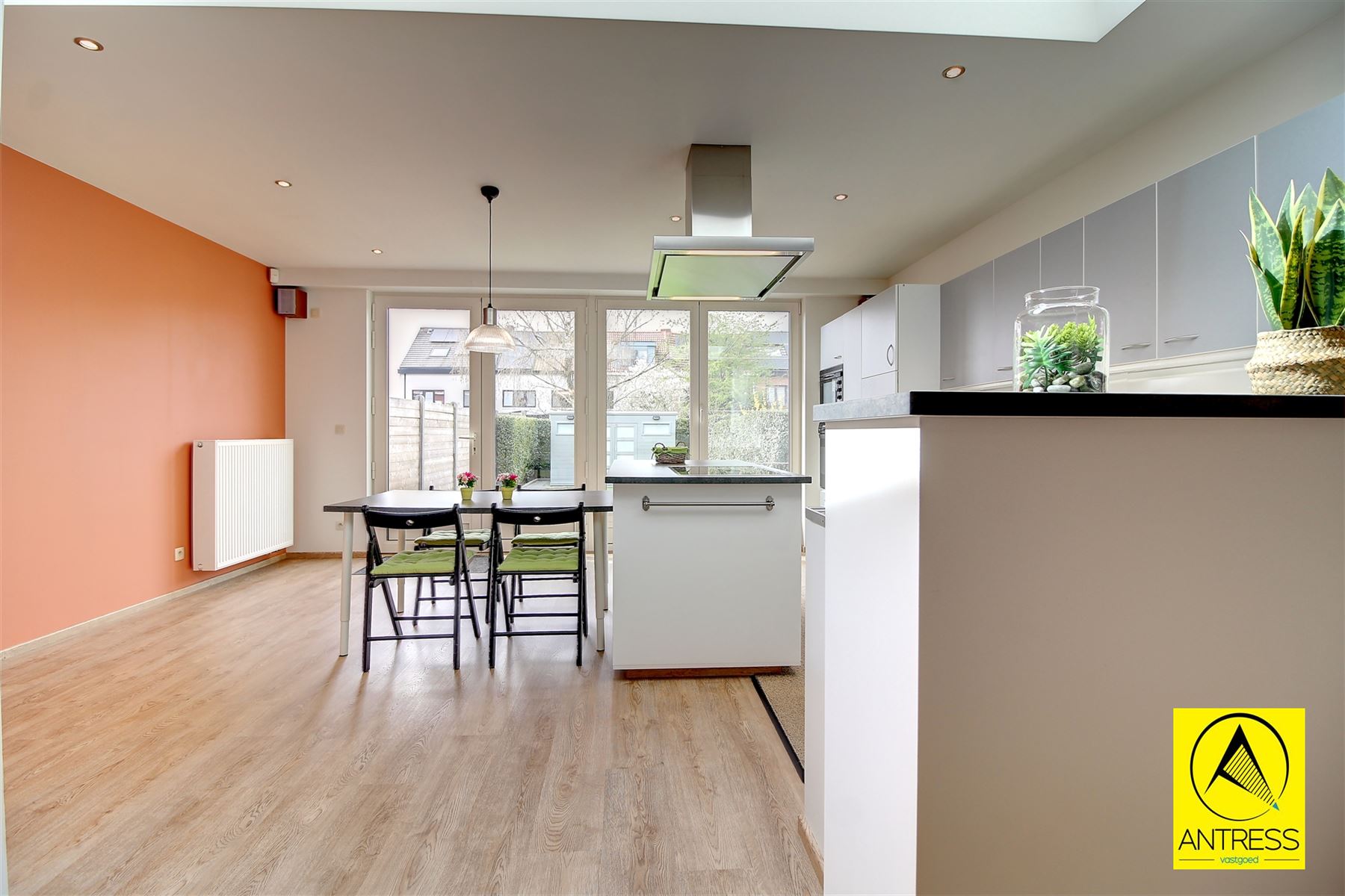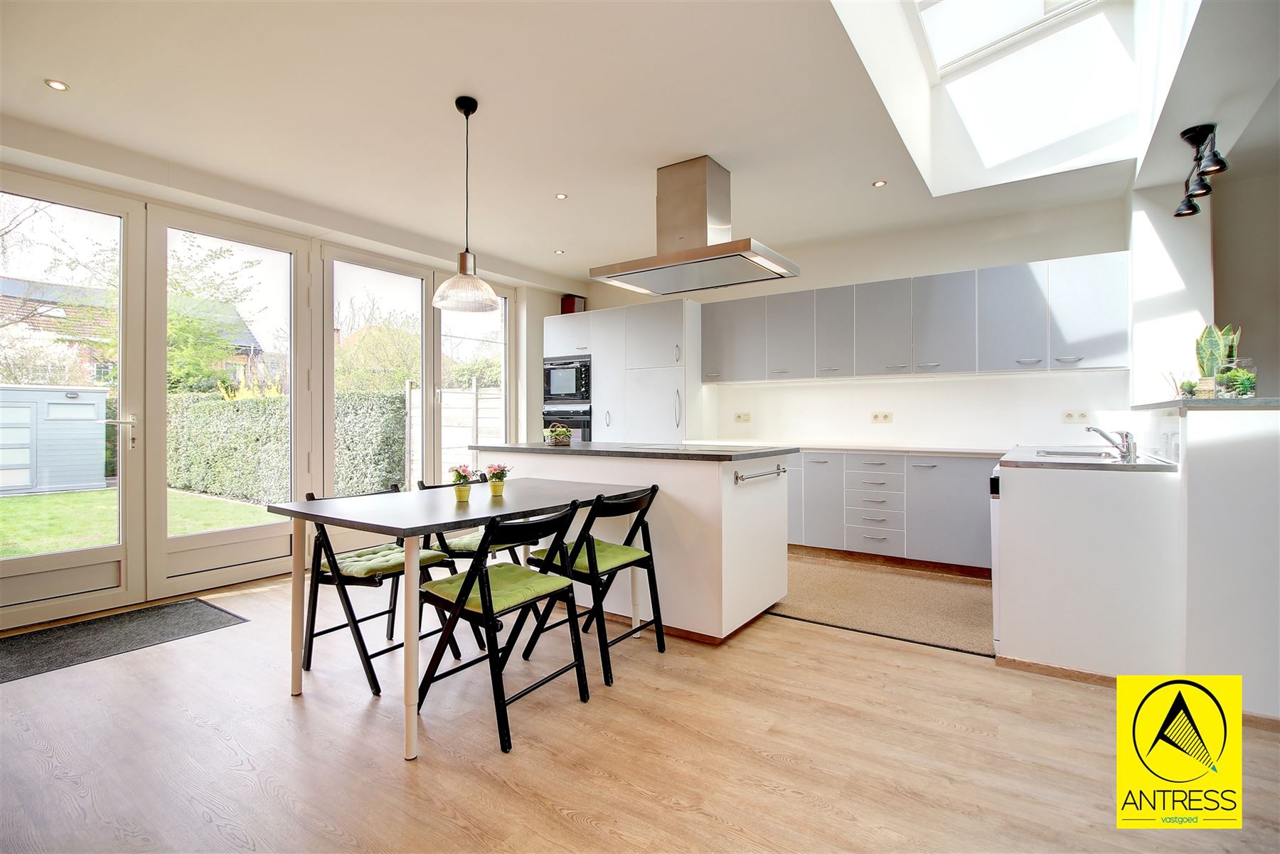 Achteraan treffen we de open keuken, voorzien van alle comfort, met dankzij de lichtstraat en kamer hoge ramen aangename lichtinval en prachtig zicht op de tuin.