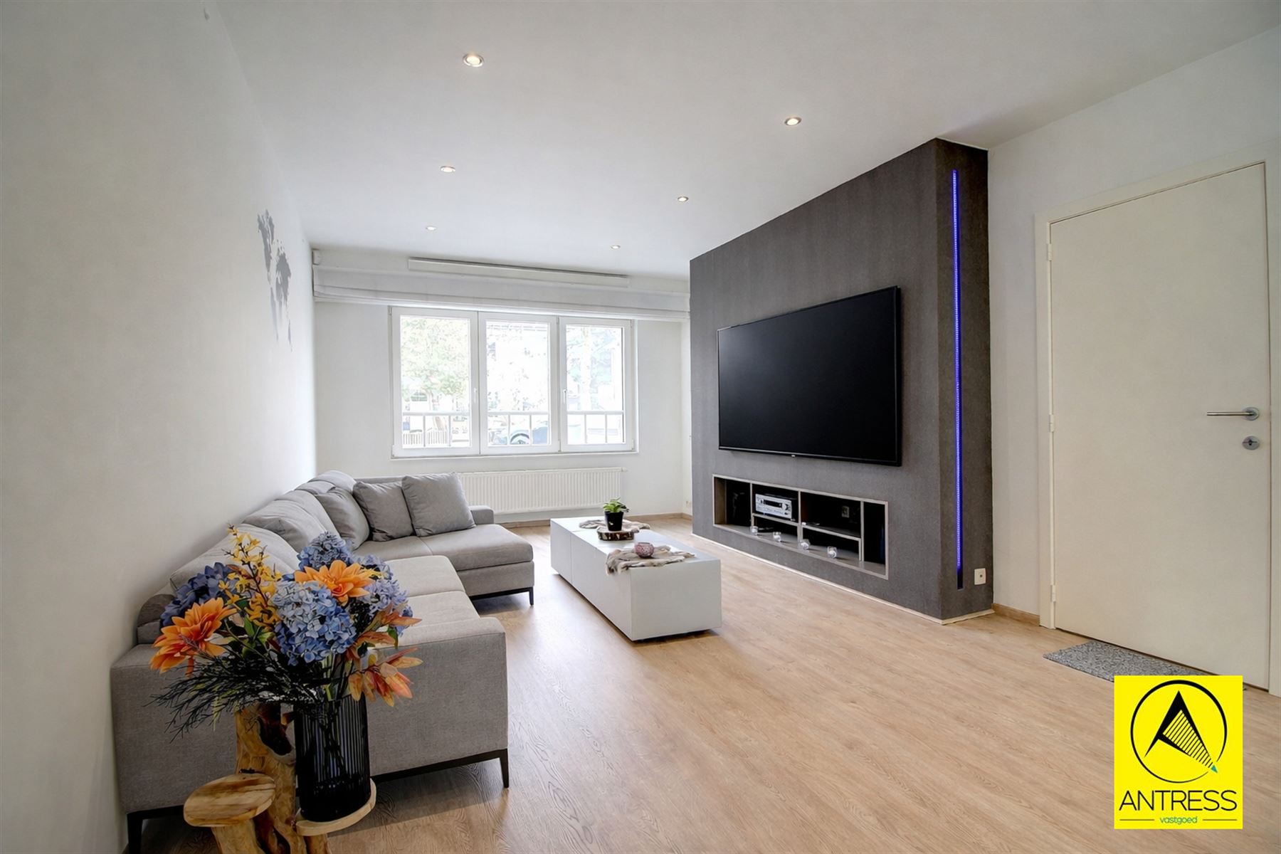 De leefkamer kan makkelijk worden ingericht met eetkamer en salon en is voorzien van bekabeling voor een surround muziekinstallatie.