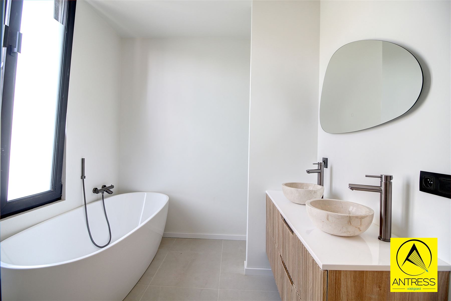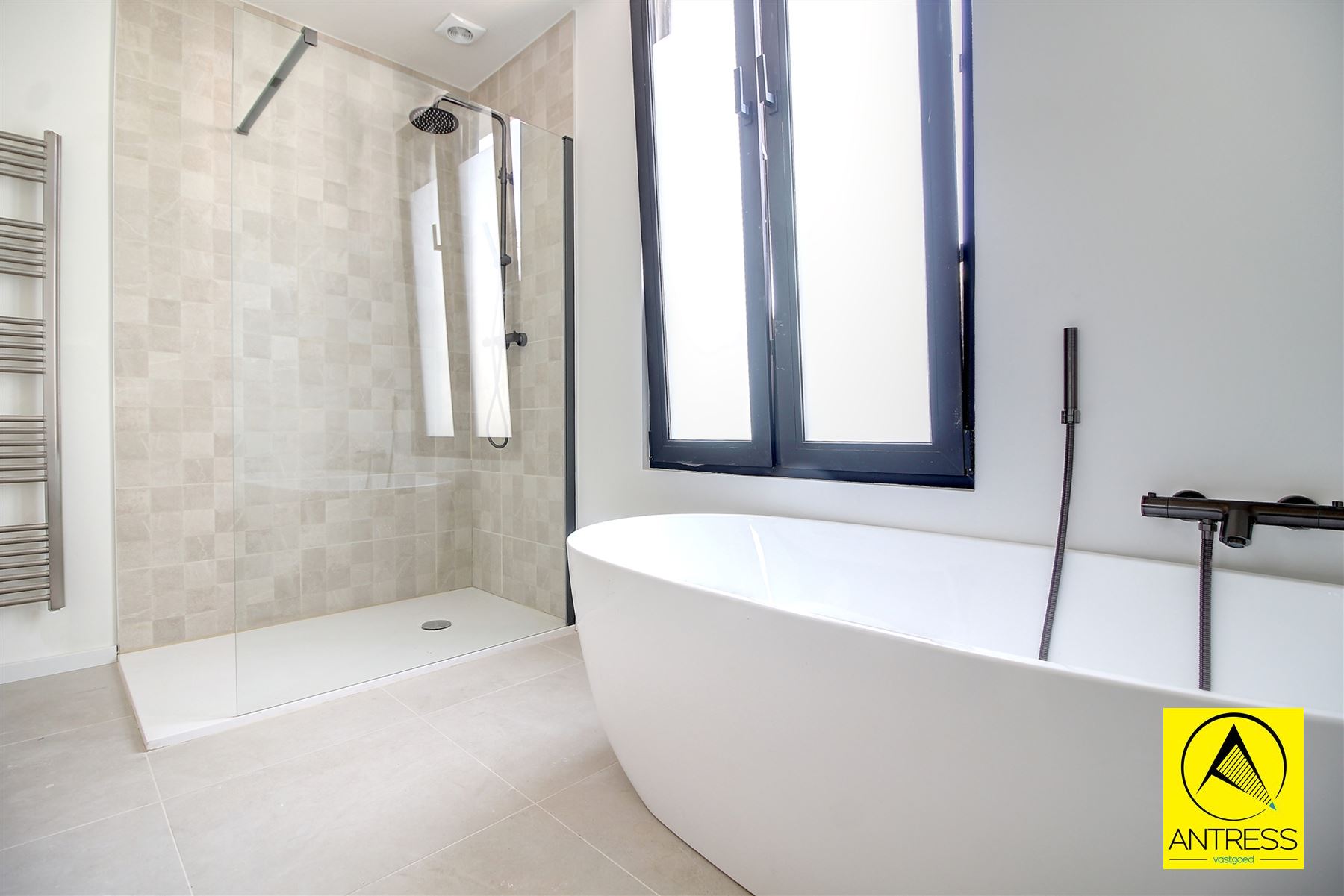 De badkamer is uitgerust met dubbele opbouw lavabo's, instapdouche, ligbad en aansluiting wasmachine/ droogkast.