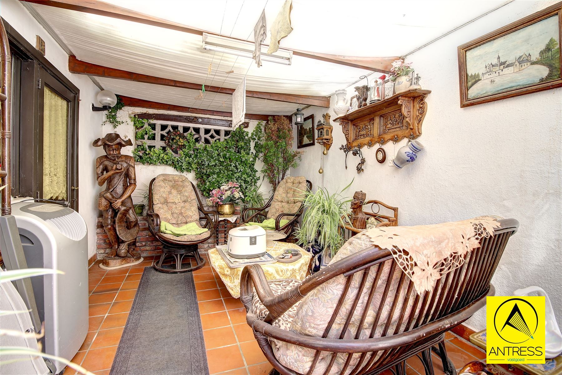 Tussen de achtergevel en de tuin werd een veranda voorzien, treffen we in een aparte kamer aansluiting wasmachine/ droogkast.