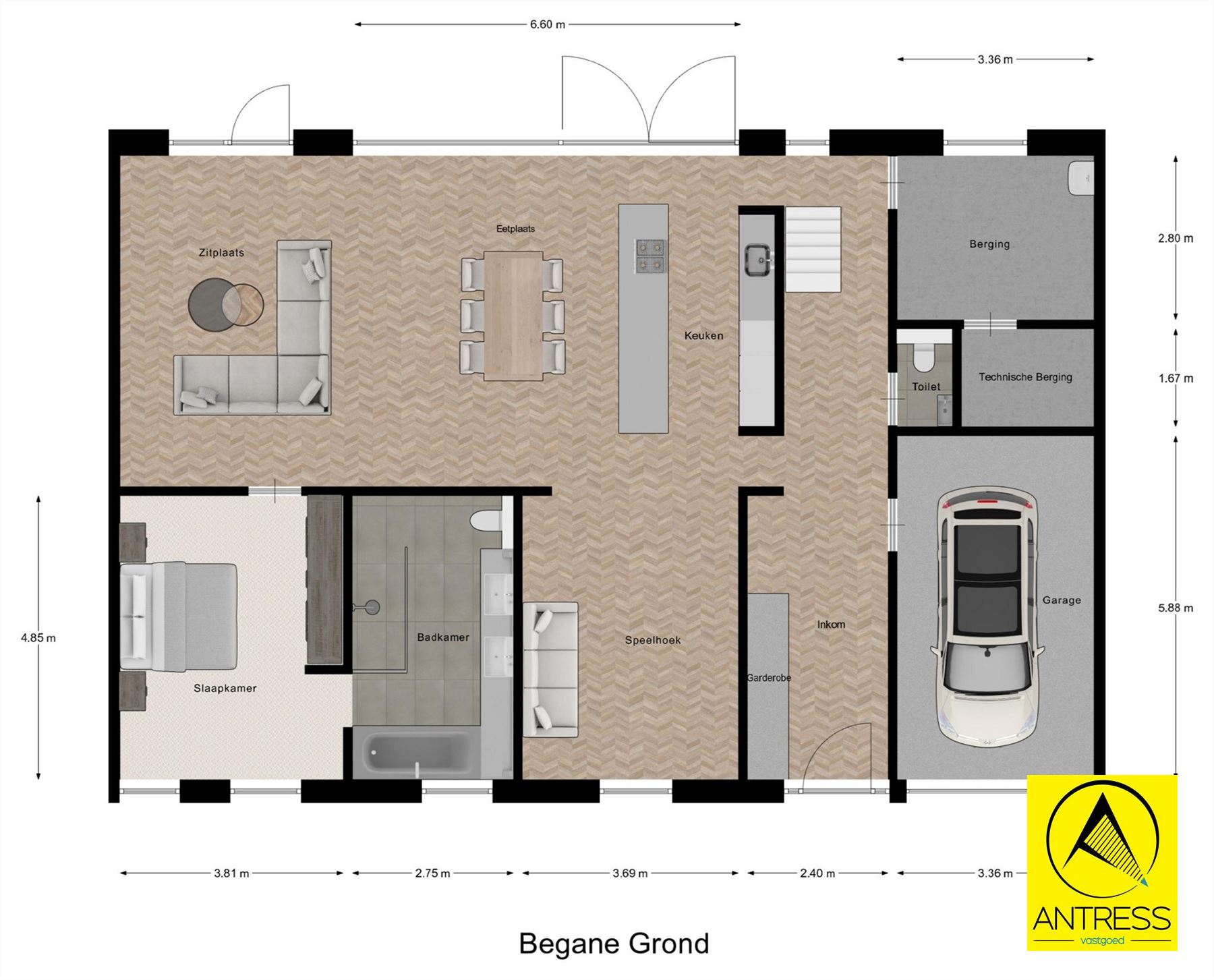 Verder treffen we op het gelijkvloers een inpandige garage, een handige berging en technische berging.