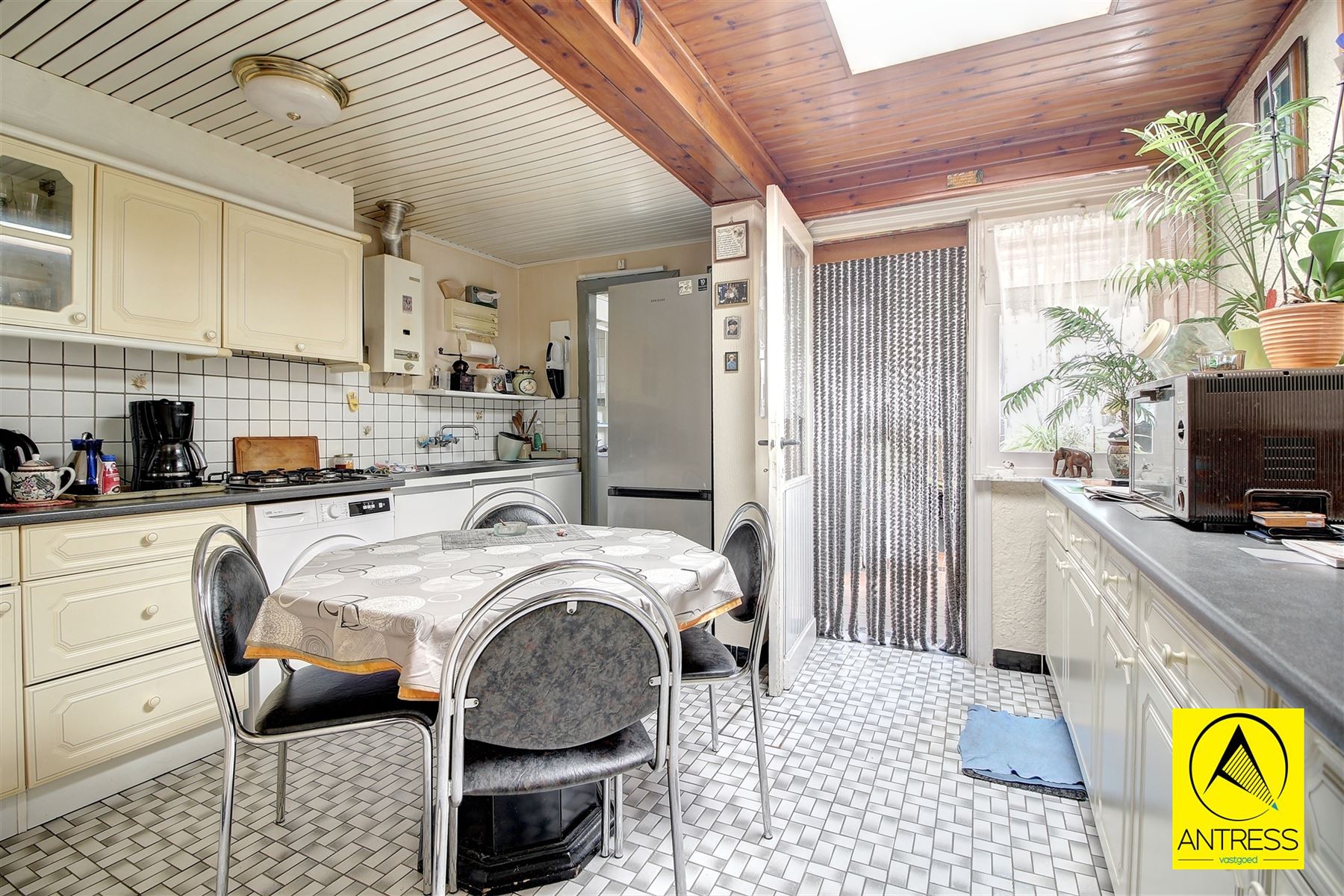 Tussen de achtergevel en de tuin werd een veranda voorzien, treffen we in een aparte kamer aansluiting wasmachine/ droogkast.